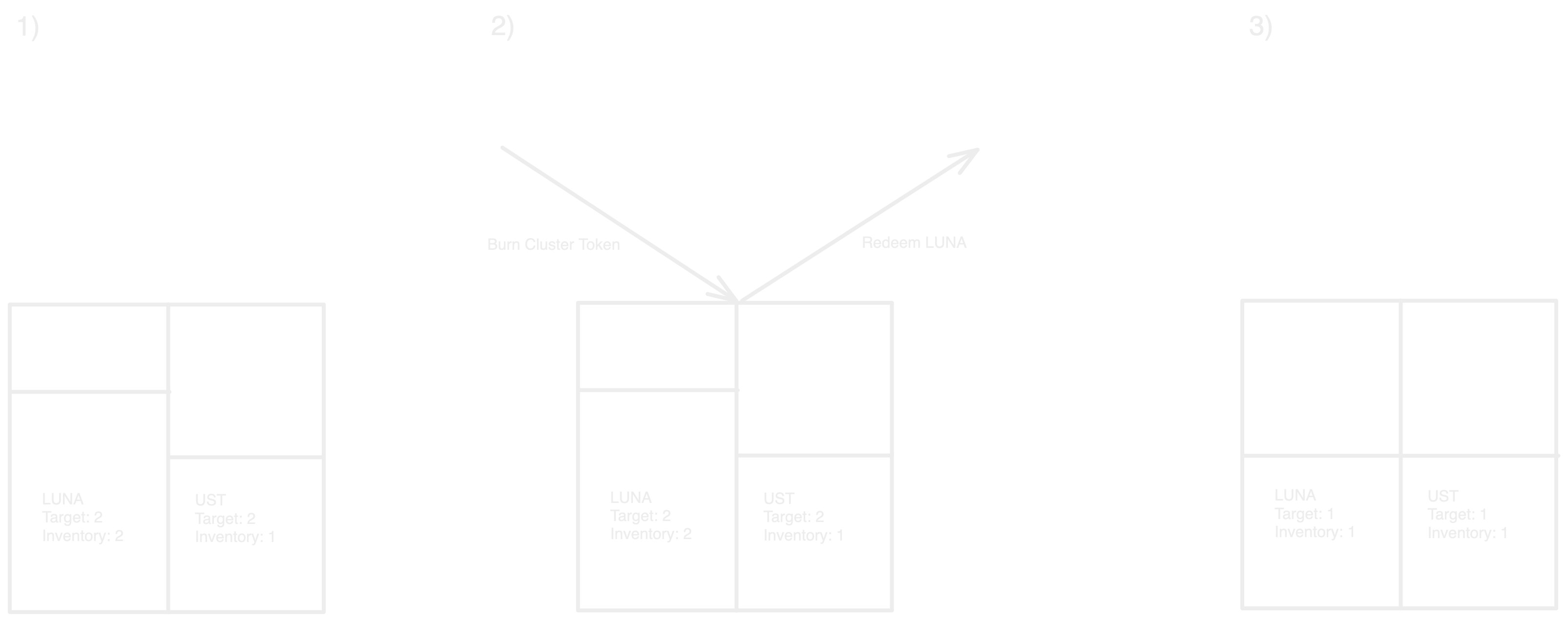 In a REDEEM operation, the user burns their cluster tokens (removes from global supply) and withdraws assets from the cluster. The amount of cluster tokens burned depends on the quality of the REDEEM operation, which corresponds to how much imbalance was corrected.